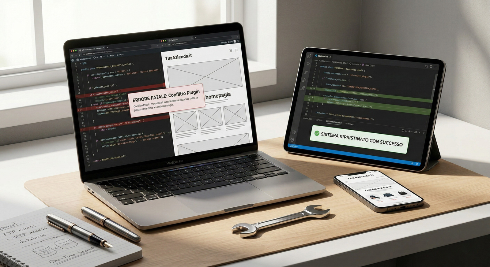 Il sito è "impazzito" dopo un aggiornamento? Individuo il plugin o il tema responsabile del conflitto, lo isolo e trovo una soluzione alternativa o ripristino la versione funzionante senza farti perdere dati.